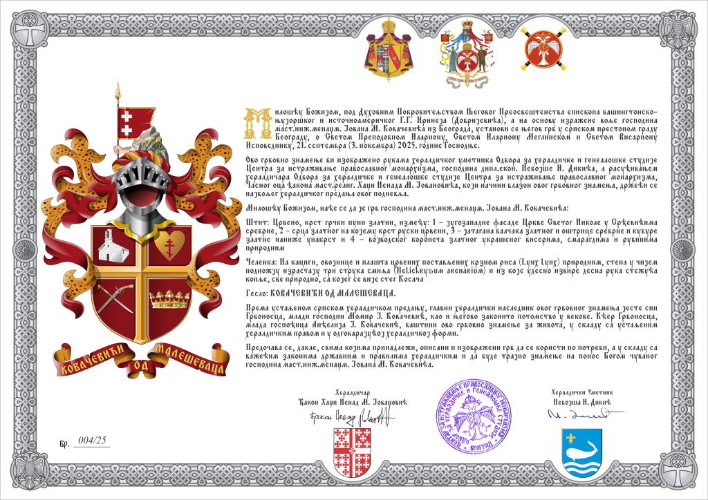 Поштујући жеље грбоносца, г. Јована Ковачевића, географско порекло његове породице, верско опредељење и националну припадност, у сарадњи са хералдичаром Одбора за хералдичке и генеалошке студије Центра за истраживање православног монархизма, Часног оца ђакона Хаџи Ненада М. Јовановића и вештином хералдичког уметника Одбора за хералдичке и генеалошке студије Центра за истраживање православног монархизма, господина Небојше Дикића, осмишљен је и израђен грб који је грбоносац прихватио новембра 2025. године.